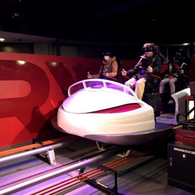 これがVRV。コースターのようなレールの上に載ったライドがVRの映像に合わせて前後に移動することで、通常のモーションライドでは体験が難しい加減速感を再現するというもの。