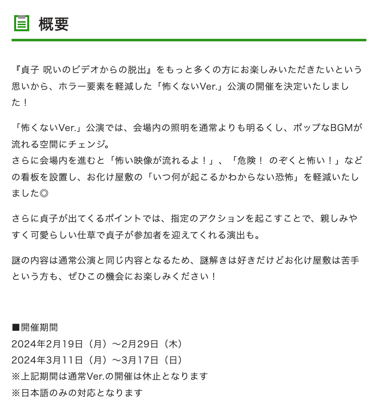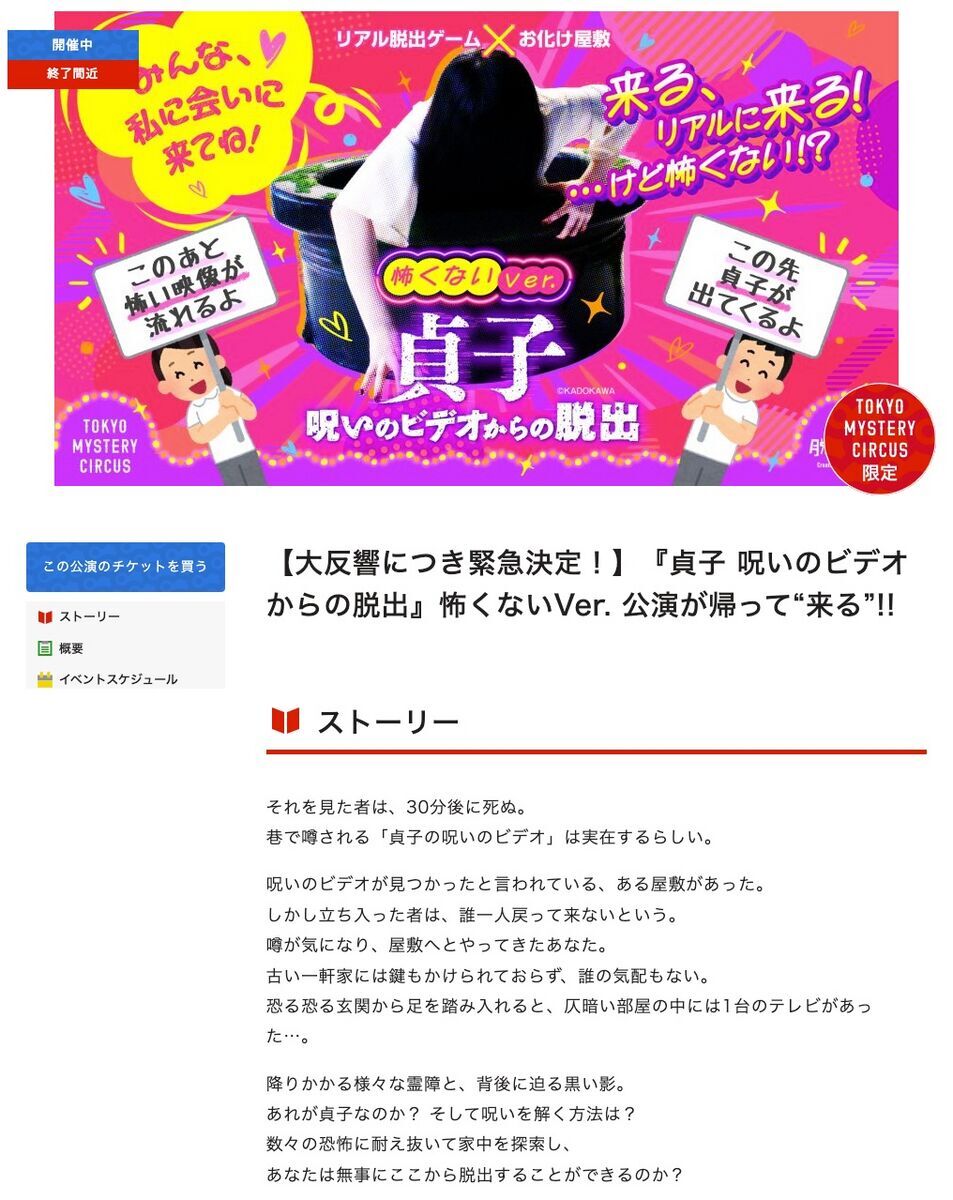 東京ミステリーサーカスで2023年1月より開催していた、お化け屋敷+リアル脱出ゲーム『貞子 呪いのビデオからの脱出』。3月31日の終了を前に【怖くないVer.】が3月17日まで開催中。