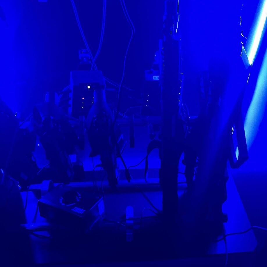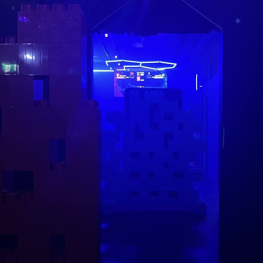 バトルフィールドはスモークと照明で演出。非対称の構造なので、どちらの色になるかで戦略は大きく変わってきます(3回のゲーム中、チームの交換もあります)。