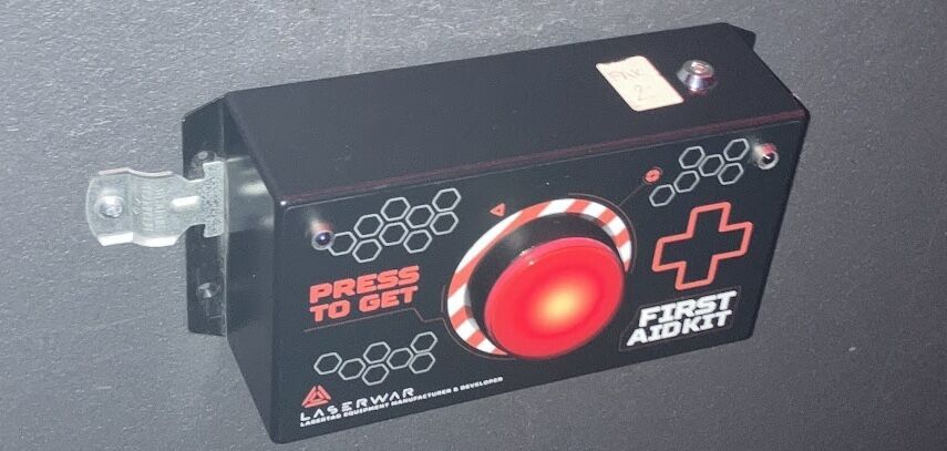 今回のゲームは4ライフ制。ヘッドバンドのセンサーを4回撃たれると戦闘不能に(撃たれたり、戦闘不能の時には銃の音やヘッドバンドの振動でも知らせてくれます)。その場合、自分の陣地にあるFIRST AID KITの前に立ち、ボタンを押すとライフが補給され、戦闘に復帰できます。